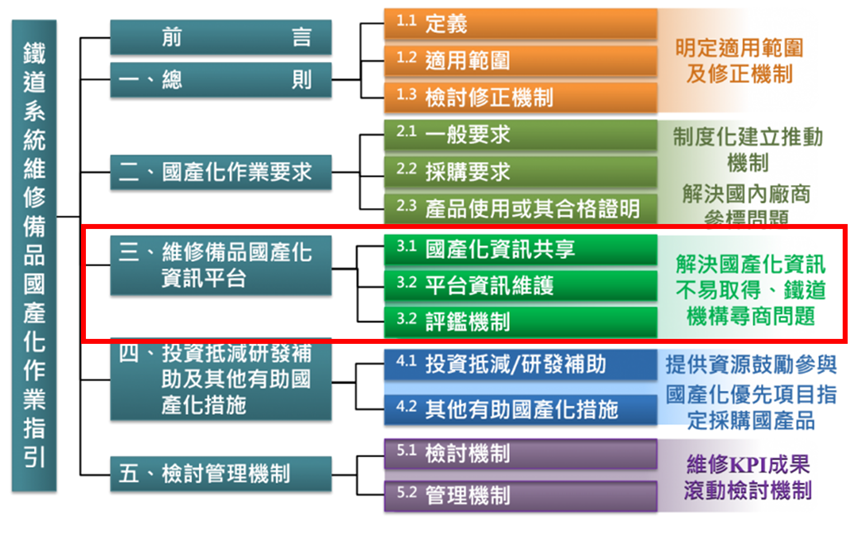 為釐清鐵道營運機構、產業界等於維修備品國產化遭遇之障礙,交通部鐵道局邀開會議,彙整各界關注議題及意見,主要包括:各機構欠缺國產化機制及統籌負責單位、國產化資訊不明致尋商不易、欠缺跨機構需求整合機制、廠商投入誘因不足、國內廠商參標資格受限、無法營造有利國產化環境及政府採購法規障礙(不熟悉)等,爰交通部於 110 年 8 月已正式頒布「鐵道系統維修備品國產化作業指引」,明訂推動機制及負責單位、營造有利國內產業界參標環境、建置國產化資料平台媒合供需互通實用資訊、整合跨機構需求及簡化採購作業、結合獎勵補助規定協助營運機構投入、鼓勵各營運機構編列研發費用及訂定分段付款合理分攤廠商研發風險,以及國產化優先項目於符合政府採購法規定下,提供可採行配套措施,期協助各鐵道營運機構建立維修備品國產化具制度化推動作法,排除相關採購障礙,並促進國內鐵道供應鏈發展及國產化資訊流通共享,以擴大維運階段國產化效益及國產化 KPI 目標之達成。